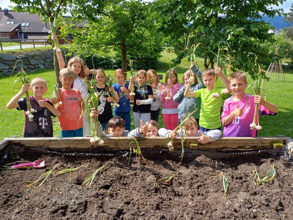 Gratulation an die Gärtner der 3. Klasse. Was am 2. Oktober liebevoll gepflanzt wurde haben wir am 14.6.2024 geerntet. Nach der dreiwöchigen Trocknung werden die Kinder ihre Knoblauchzöpfe mit nachhause nehmen können.