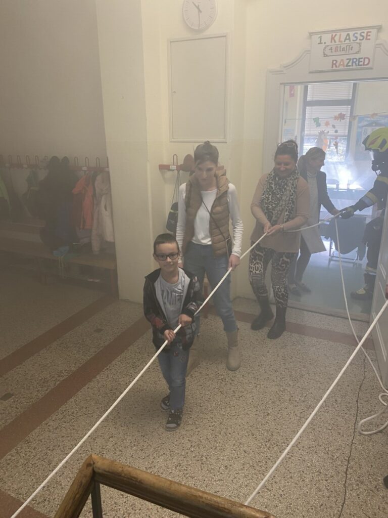 15.11.2023 so gasilci iz Diče vasi, pod vodstvom komandanta gospoda Uweta Guggenbergerja, prišli v šolo na obisk. Šolarjem so razložili delogasilcev. Medtem ko so otrociz navdušenjem poslušali, so nekaterigasilci pripravilirealističen alarm. Ko so vsi otrocizapustili poslopje, smo opazili, daen razred manjka. Že so se pripeljali gasilci. Hitro so rešili vsešolarje. Tako so otrocidobro spoznali, kako se pravilno vedejo v slučaju požara.